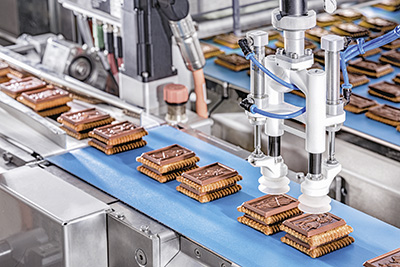 Mit seinem platzsparenden Maschinenlayout fügt sich der neue Flowpacker nicht nur nahtlos in seinen Aufstellort ein, sondern bietet obendrein auch deutlich mehr Funktionalität und Performance. Anstelle von vormals zehn ermöglichen nun acht F4-Arme im Doppelpick-Verfahren einen Durchsatz von bis zu 728 Produkten pro Minute, ohne dass bei dieser Taktzahl die Laufruhe beeinträchtigt würde. Das fortschrittliche Bildverarbeitungssystem von Schubert stellt dabei sicher, dass die Waren nicht nur schnell, sondern auch stets in einwandfreiem Zustand vom mittig angeordneten Produktband auf die Kette mit den Tray-Formaten oder wahlweise auf das Band für das Flowpack-Format abgelegt werden. Gerade beim Handling der teilweise oder vollständig schokolierten Biscuits spielt der integrierte Folienspender mit kurzer Kette seine Vorteile aus. Da die Vorgruppierung auf einem Band erfolgt, gestaltet sich die Reinigung wesentlich einfacher. Aufgrund der kürzeren Kettenlänge müssen beim Formatwechsel deutlich weniger Mitnehmer getauscht werden, als dies bei einer langen Kette der Fall wäre. Der Vorgang erfordert nur einen Bediener und keine Mitnehmer-Kassette, sodass sich obendrein Kosten sparen lassen.