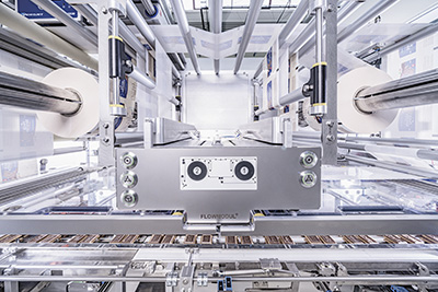 Im Flowmodul erfolgt die Kombination aus Längssiegelung mittels Ultraschall und Quersiegelung mit Heisssiegel und fliegender Quersiegeleinheit – einschliesslich Anbringung eines Aufreissfadens.