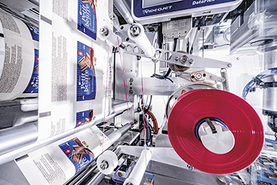 Da die Magazinplatte aufgrund identischer Tray-Abmasse für alle Formate gleich ist, kann eine einzige Person den Werkzeugwechsel durchführen. Gibt es wie im Fall des Choc Petit Beurre sowohl ein Flowpack- als auch ein Tray-Format, genügt ein einziger Klick auf dem Bedienterminal, um den Verpackungsprozess umzustellen. Sollen die Produkte direkt in die Schlauchbeutel verpackt werden, wird der Tray-Entstapler ohne weitere Umbauten einfach aus dem Verpackungsprozess genommen. Im Flowmodul sorgt die bewährte Kombination aus Längssiegelung mittels Ultraschall-Verfahren und anschliessender Quersiegelung mit Heisssiegel für einen schonenden und zugleich sicheren Verschluss. Die fliegende Quersiegeleinheit stellt zudem sicher, dass bei ungleichmässigem Fluss die Siegelzeit und -temperatur konstant bleibt. Da die so erzeugten Pakete sehr eng ausgelegt sind, kommen zwei verschiedene Formschultern zum Einsatz, um unterschiedliche Formate abzudecken. Ein Novum – und aus Platzgründen auch eine kleine Herausforderung – stellte die Integration eines Aufreissfadens beim Flowpack dar, die von den Schubert-Ingenieuren souverän gelöst wurde. Der rote Kunststofffaden wird parallel zum Flowmodul-Film abgewickelt, an dem er mittels Klebeschicht haftet, und anschliessend mitversiegelt.